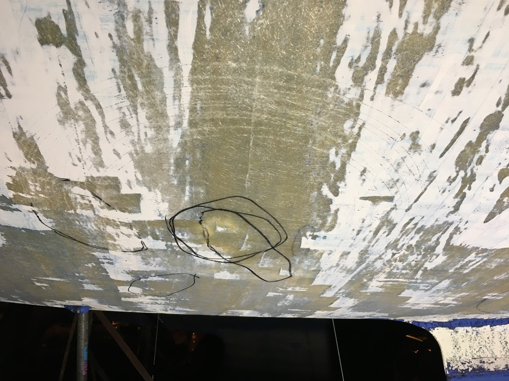 Minulla on käytössä geelikerroksen poistoon tarkoitettu höylä jolla koko pohjasta on nyt poistettu gelkkari. Sillä voisi esim. poistaa neliön muotoisen alueen koko vaurioituneelta alalta, sitten poistaa delaminoitunutta kohtaa keskellä enemmän, ja sitten laminoida uutta kuitua päälle. Toinen olisi rälläköidä keskellä oleva delaminoitunut kohta ja laittaa uutta kuitua. Läpi ei saisi mennä, koska nopeasti arvioiden vaurio on aikalailla veneen penkin reunan kohdalla, eli luultavasti tosi vaikea laminoida sisältä päin. Yksi vaihtoehto on tietysti maalit päälle ja antaa vaurion olla, onhan se kestänyt tähänkin asti. Mutta kun pohja on nyt kuitenkin rempassa...