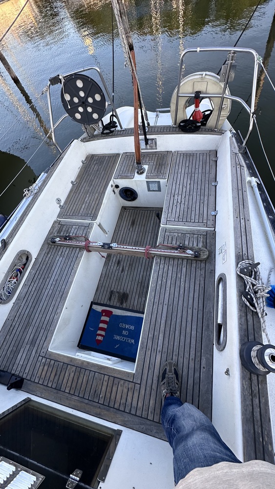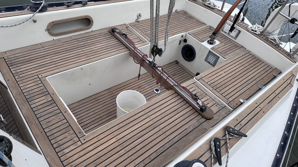 Putsasin Hempelin Teak Cleanerillä istumalaatikon nuhjuisen harmaat, jäkälän rankasti läikittämät tiikkipinnat. Tuntikausien uurastus. Tulos miellyttää silmää, samoin raikas puhtaan puun tuoksu. Pieniä jäkäläläisiä jälkiä jäi vielä paikoin, olkoon. Ehkä hinkuttelen pois, ehkä en. Mustat saumat osin repsottaa ja osa ruuvien päällä olleista tiikkitulpista puuttuu, korjaukset ehkä 2025, jos jaksan.